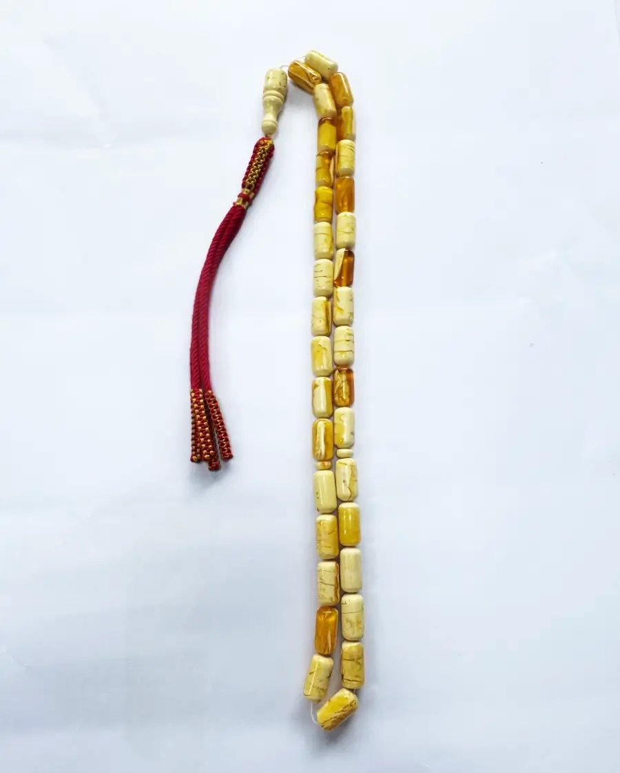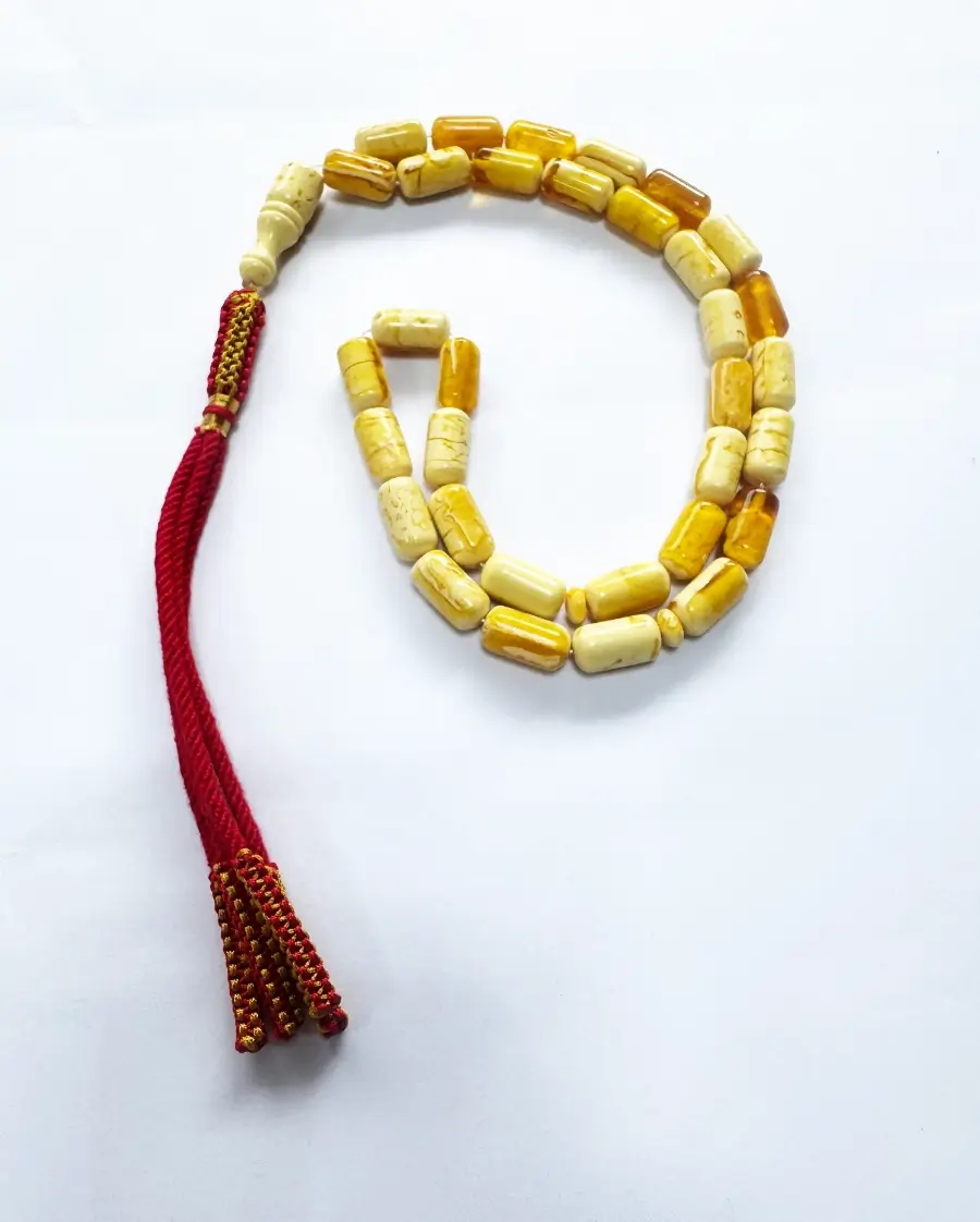 Elevate your spiritual practice with these Exclusive yellow amber Muslim prayer beads. The beads are meticulously shaped into smooth cylinders, showcasing a beautiful marbled effect of buttery yellow and creamy white tones. This lightweight material is favored for its warmth and comfort, making it an ideal companion for daily prayers and meditation.